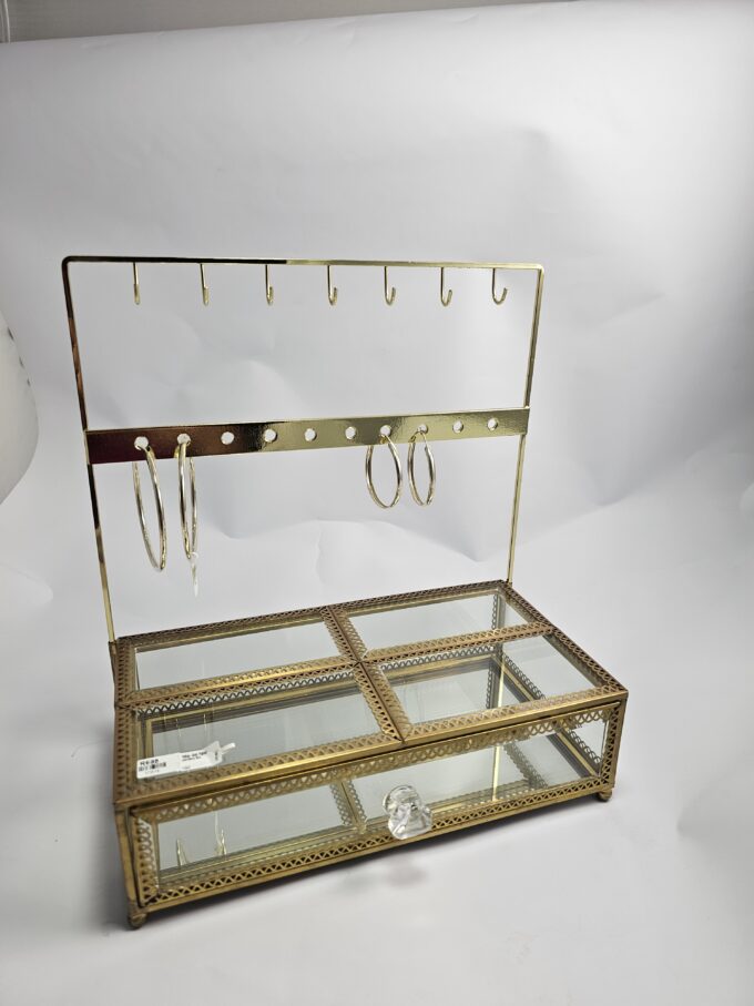 This is more than an organiser; it is a statement. The stunning fusion of crystal-clear glass and polished, gold-finished metal captures and reflects the light, making your collection sparkle. Watch as your necklaces, bracelets, and earrings are elevated from simple storage to a curated display that speaks to a life of discerning taste.